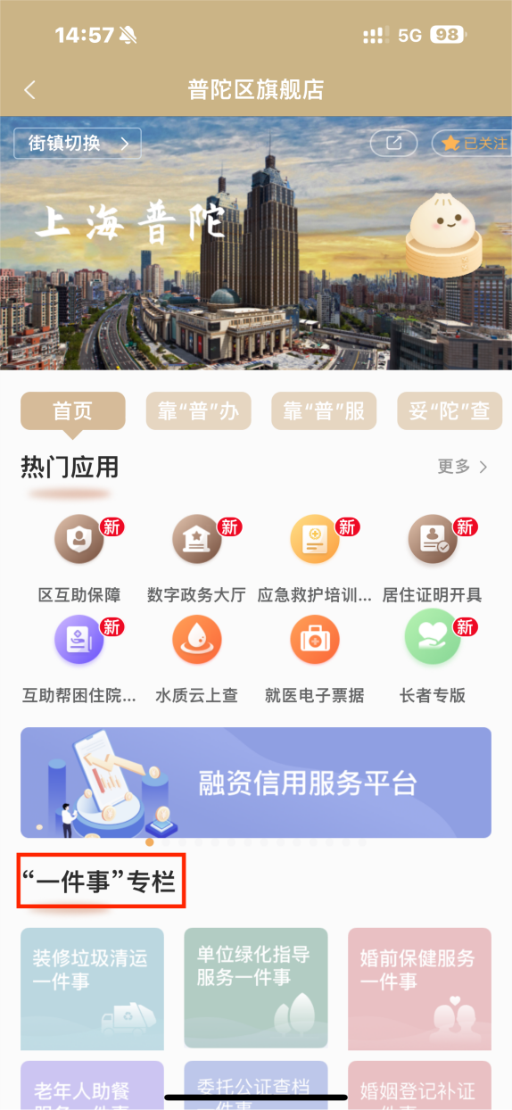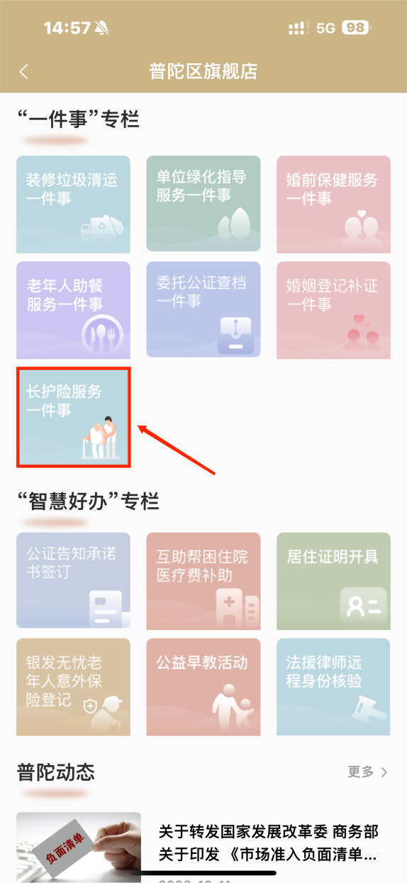 ②在“普陀旗舰店”首页找到“一件事”专栏,点击进入“长护险服务一件事”
