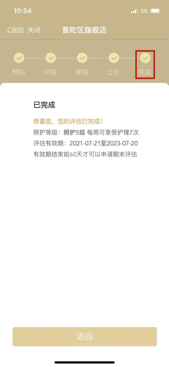 ⑨ “长护险评估进度推送”查询结果会显示当前参保老人评估进度与时间信息,已完成的阶段节点也可以点击查看详情(未完成阶段节点会显示为灰色)