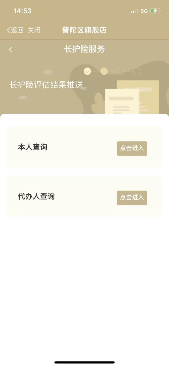 ⑤选择任意一种评估推送服务后,根据查询用户的身份,分别选择“本人查询”或“代办人查询”,点击进入(代办人的认定以老人申请评估时填报的代办人信息为准)