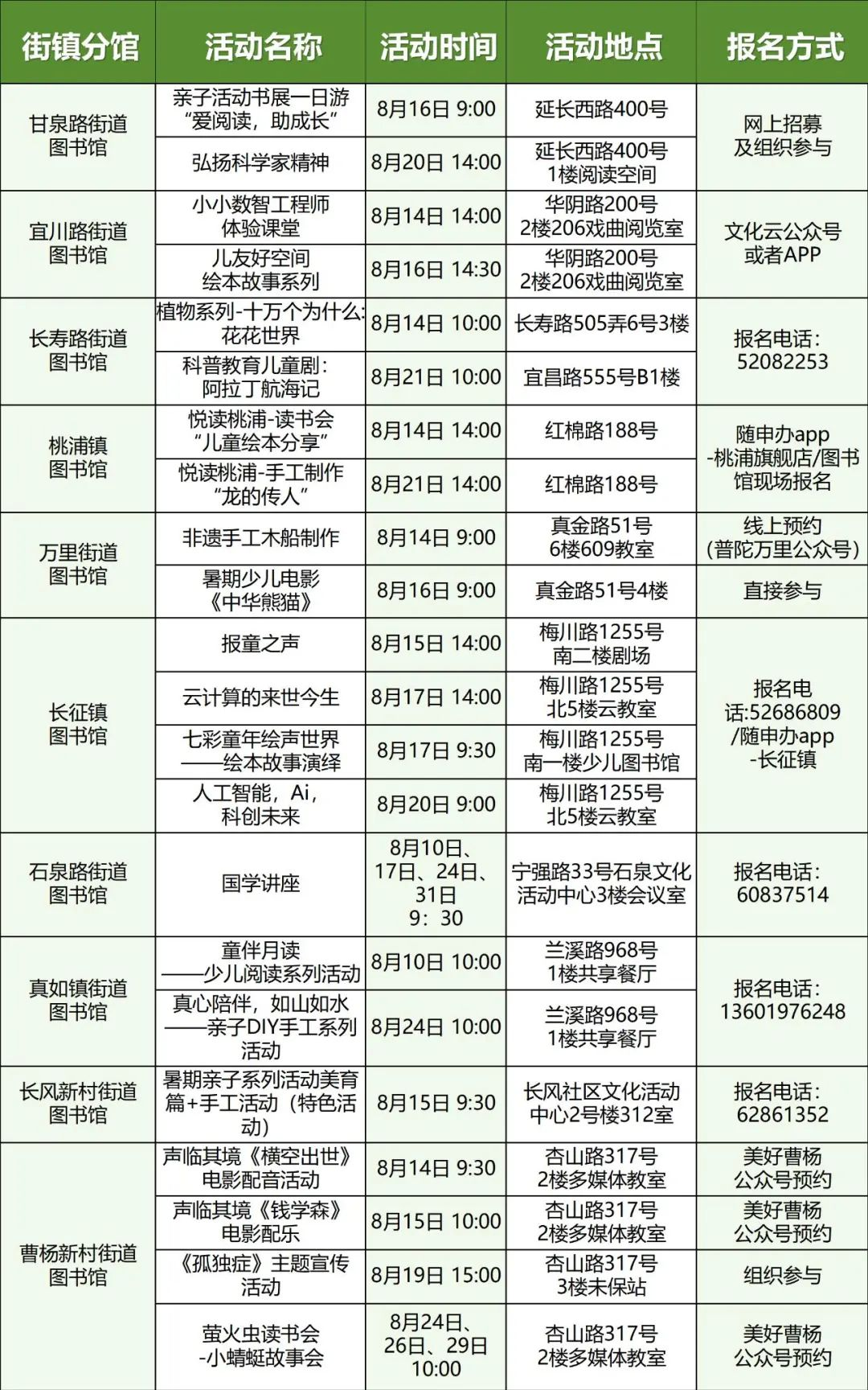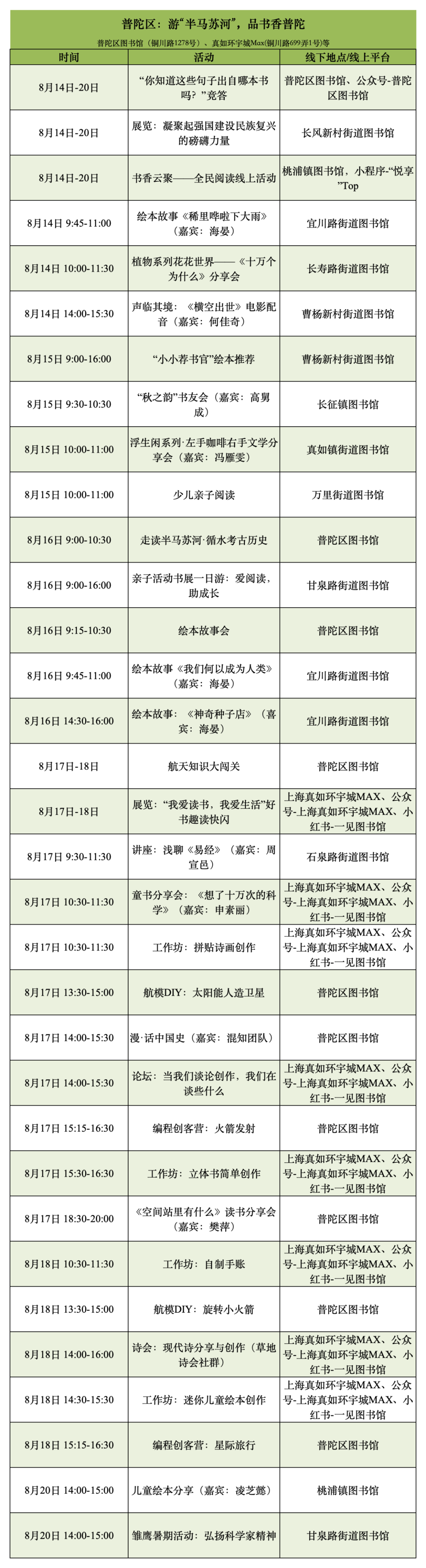 这里要温馨提醒市民,部分活动参与人数有限,请关注“上海普陀文旅”“上海市普陀区图书馆”微信公众号报名(详情将于活动开始前发布)。