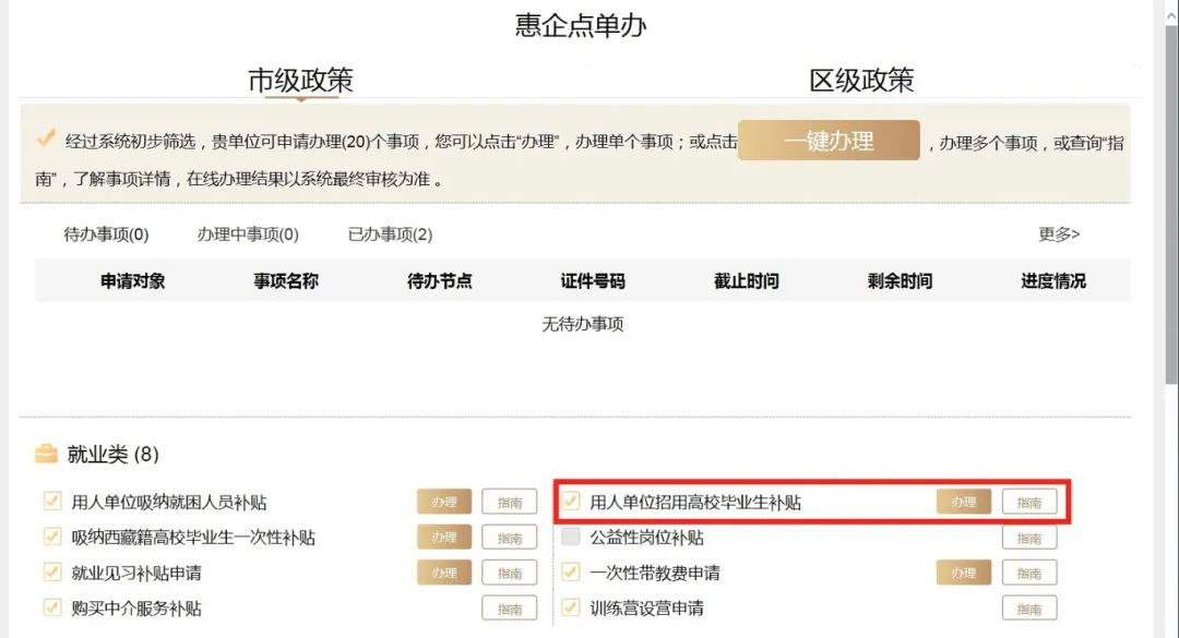 1、符合条件的用人单位,可在为高校毕业生办理就业参保登记手续的次月起,进入上海市人力资源和社会保障自助经办系统“惠企点单办(就业补贴)”,点击开始办理“用人单位招用高校毕业生补贴”。