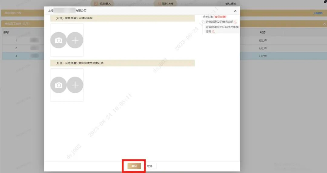 (1)单位资料上传界面,劳务派遣公司需上传情况说明与补贴使用协商证明(模板可在办事指南中下载);其他用人单位无需另外上传材料,可直接点击“确定”。