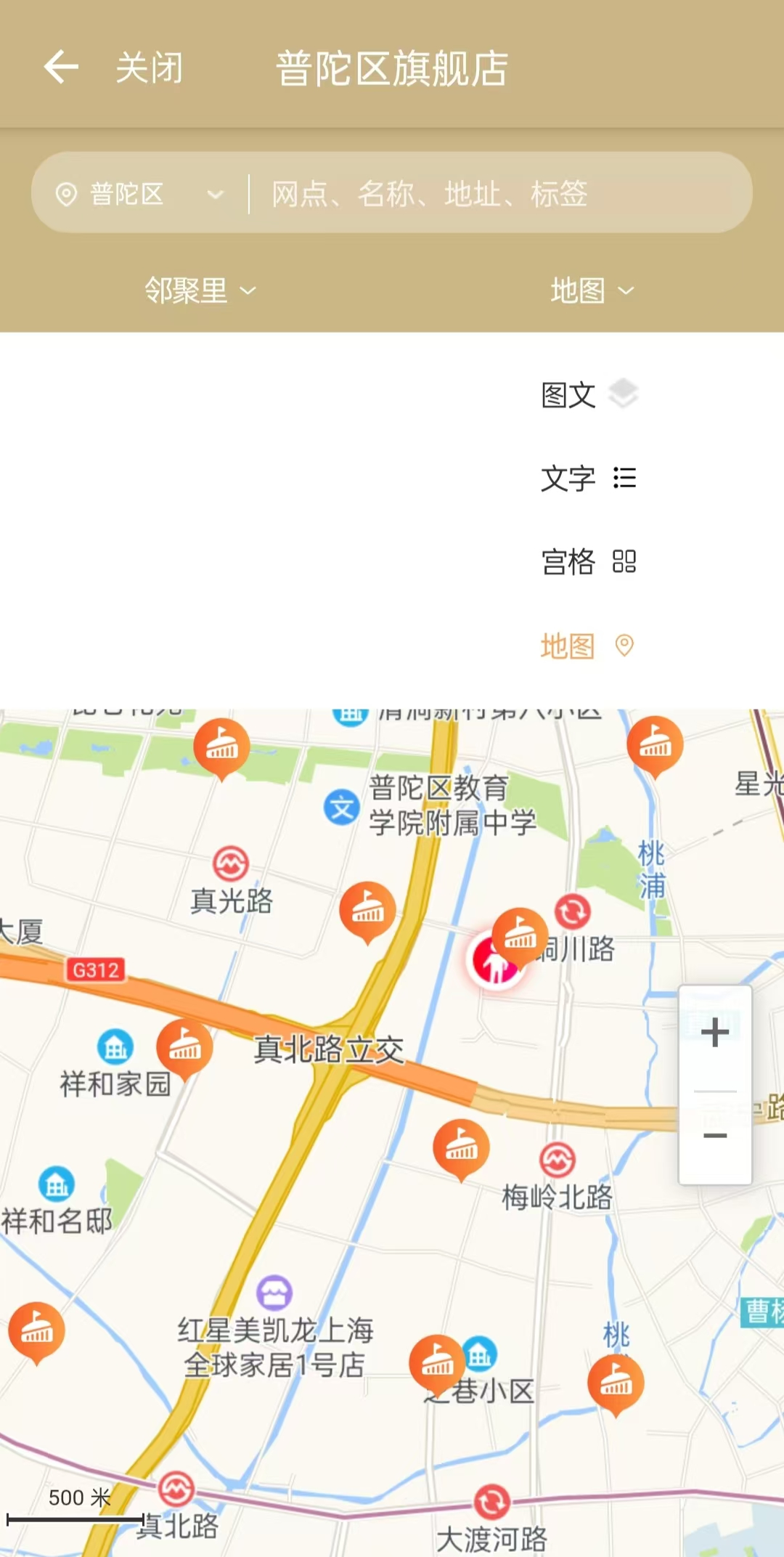 为了让大家能更方便的找到自己的片区,页面上还有片区地图功能,点击片区图标,大家可选择下方的搜索周边和查看,此外还可以切换显示的样式,如图文、文字、宫格和地图,根据您的喜好自由切换哦