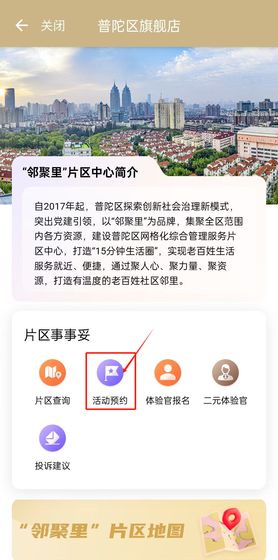 第三步:进入页面,大家可以看到的第一个功能区域就是“片区事事妥”,各位居民朋友如果需要报名一些活动,可以点击活动预约,选择自己感兴趣的活动进行报名