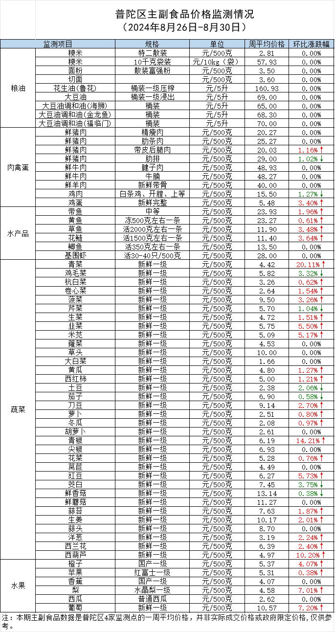 普陀区主副食品价格监测情况 (2024年8月30日)