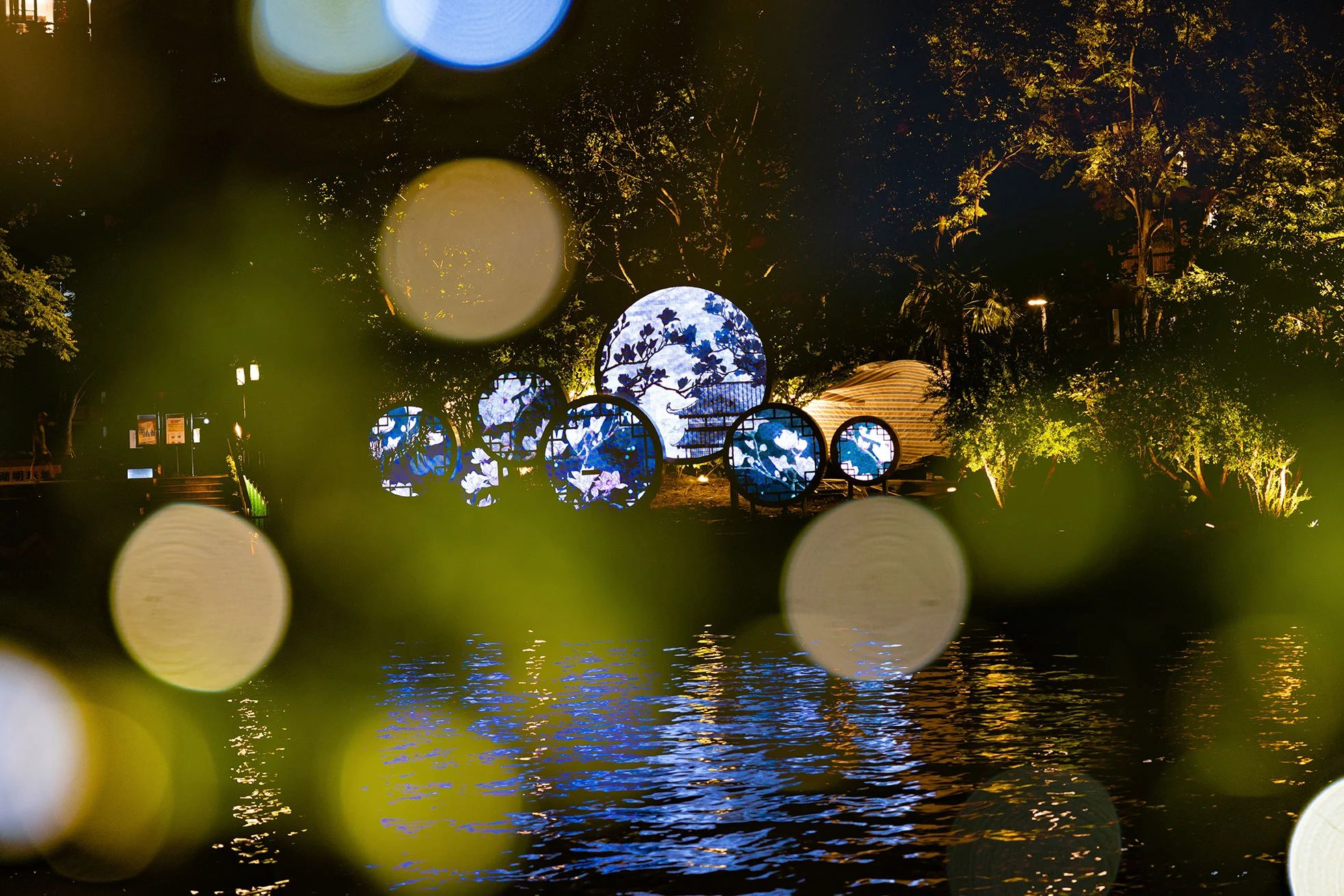 潘家湾往西途径昌化路桥,抵达梦清湾滨水空间。随着夜幕的降临,生态草岸上的雾森系统轻轻开启,轻柔的雾气缓缓升起,其间穿插着形态各异的小动物灯光小品,令人仿佛置身于一个生动的自然画卷之中。从游船视角望去,《山涧溪流》装置巧妙地模拟了山涧溪流的自然风貌,光影交错间,仿佛真的在一条蜿蜒曲折的山涧中穿梭。
