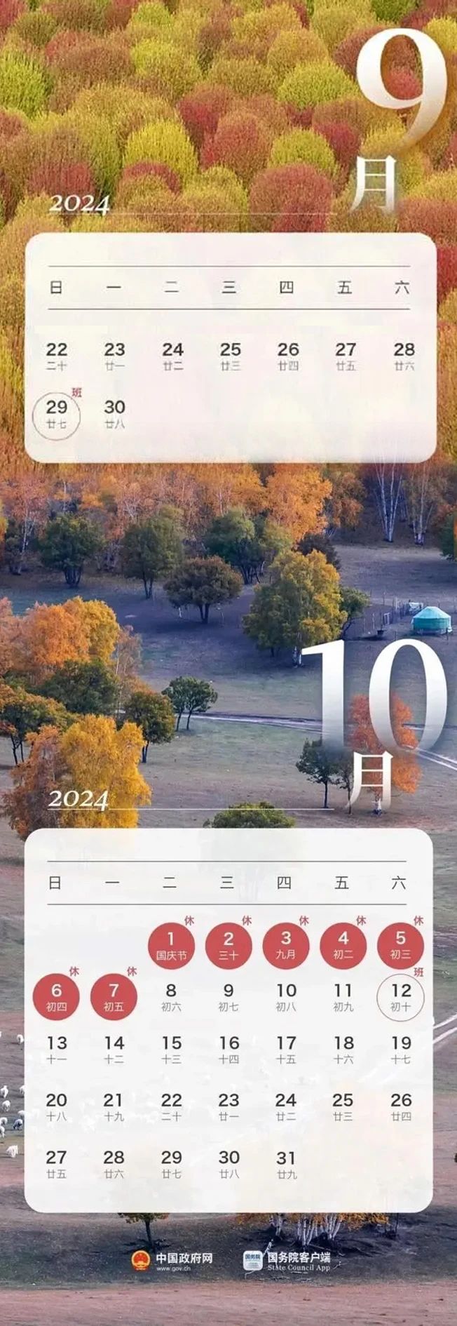 10月1日至10月7日,国庆节放假调休共7天,9月29日(星期日)和10月12日(星期六)上班。