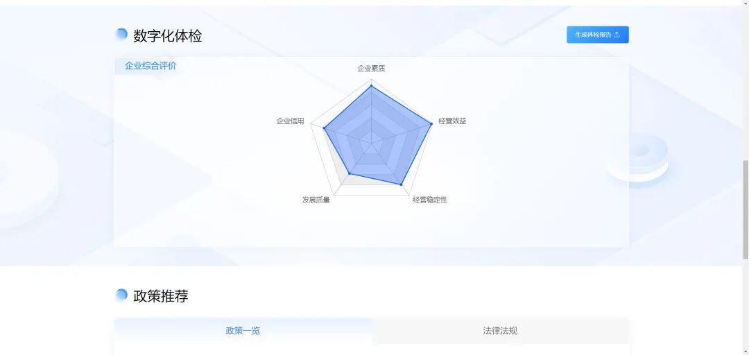 数字版企业“健康体检报告”中,依托大数据,通过五维雷达图的方式,立体展示企业在基本素质、经营效益、运营稳定性、企业信用、发展质量五个维度上的综合评价。