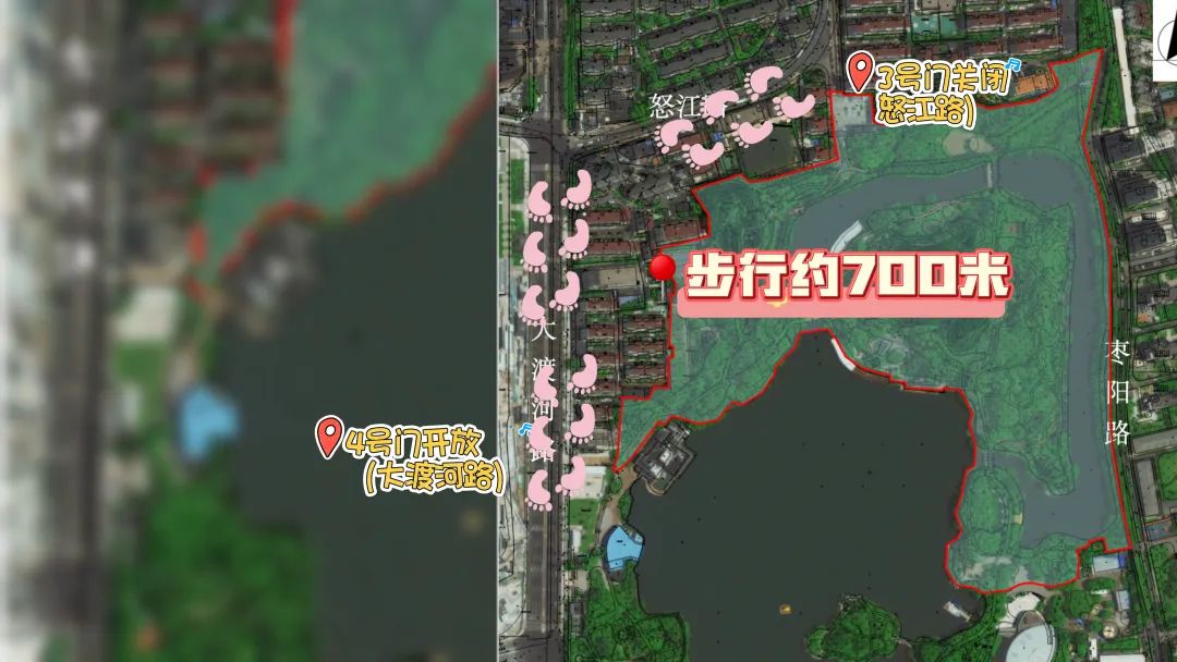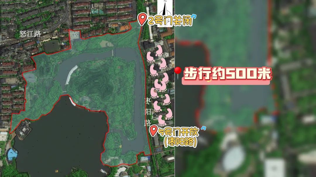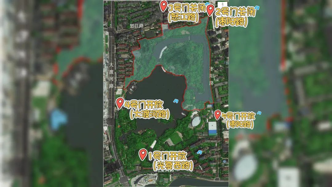 为确保改造工程的顺利推进,普陀区已在公园各入口及显眼位置设置了多处闭园绕行示意图。示意图指出,自10月10日起,2号门(枣阳路)、3号门(怒江路及原有停车场)将实行封闭管理,敬请游客朋友们留意调整入园路线,选择其他开放的1号门(光复西路)、4号门(大渡河路)及5号门(枣阳路)进出。