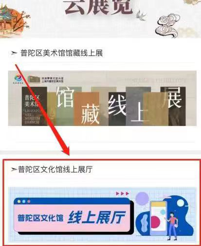 打开【文化普陀云】App,从首页点击【云展】板块,选择【普陀区文化馆线上展厅】进入。