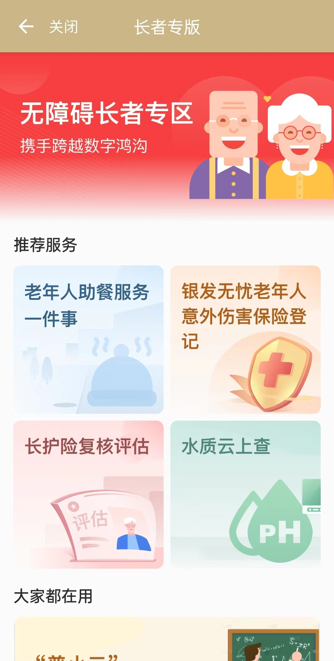 在“无障碍长者专区”中,您可以找到“老年人助餐服务一件事”、“水质云上查”、“查养老”、“找医院”等服务