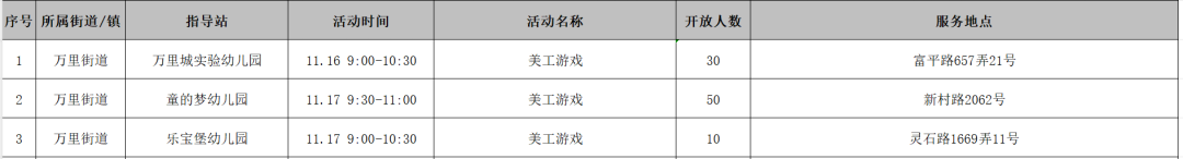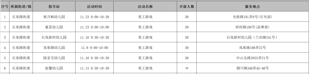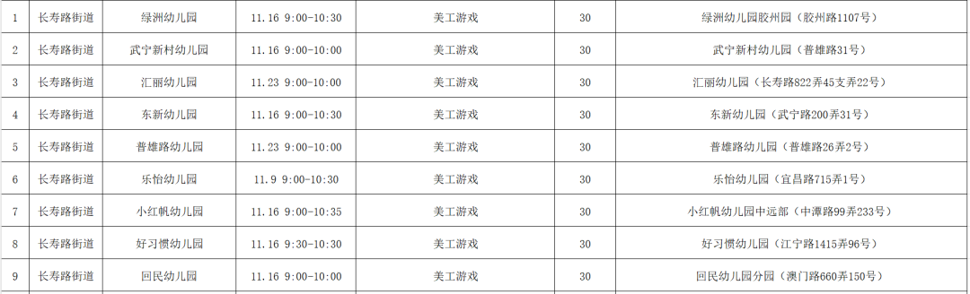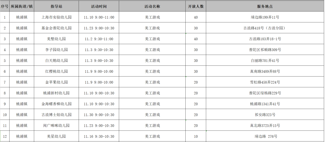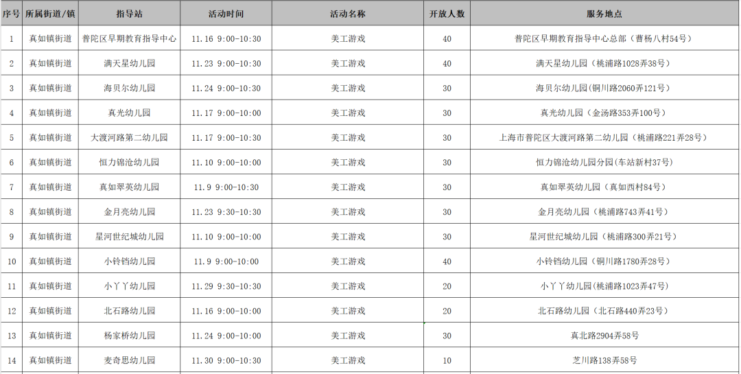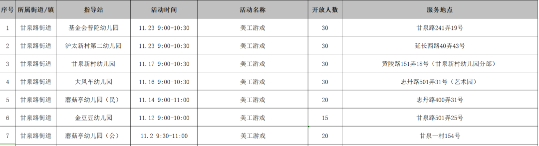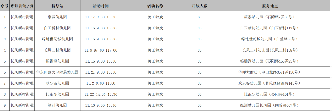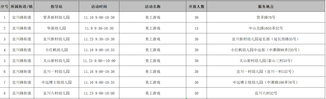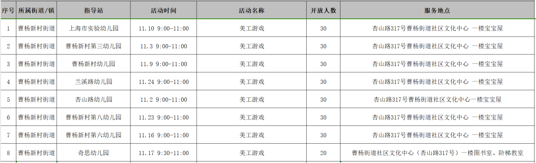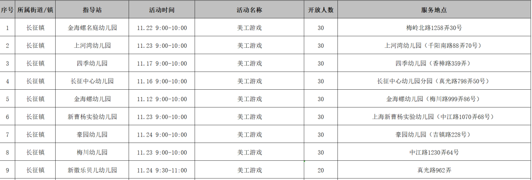 来源: 上海普陀11月起,普陀区各早期教育指导站将以“科学育儿——美工游戏”为主题,在全区10个街镇的公(民)办幼儿园内开展亲子游戏活动,面向辖区内3岁以下婴幼儿家庭提供线下科学育儿指导免费公益服务。感兴趣的家长们快来报名吧~