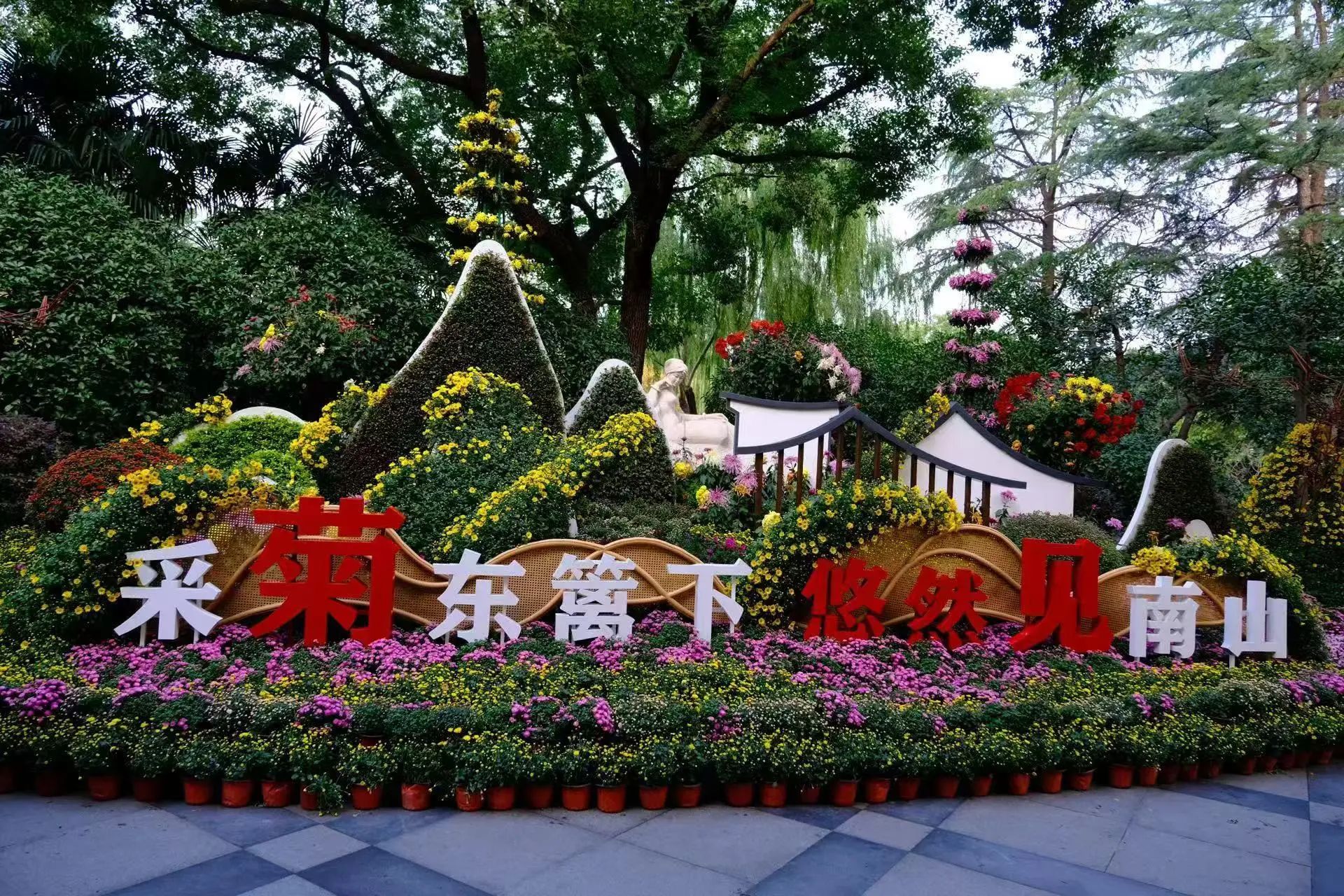 花展以公园入口处中心花坛为主景,整个花坛以各式菊花、假山、篱笆、隐约的小屋等元素,呈现古人在南山下的自然田园中,悠闲赏花、享受生活之惬意。鲜花丛中吉祥鸟孔雀造型,意寓吉祥美好。点明花展主题,且具观赏性。