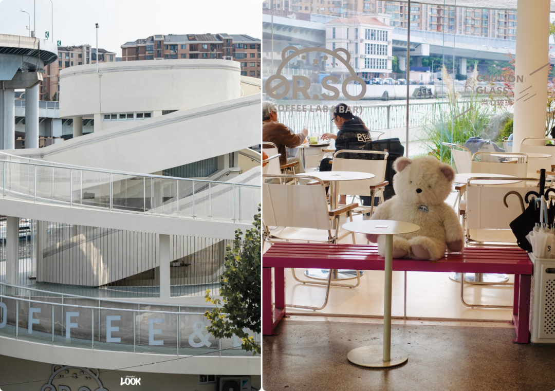 OR.SO Coffee Lab&bar的白色旋转楼梯很出片,沿着环绕式步道还可以观赏苏州河畔风景。走入店内,点一杯咖啡,透过明净的玻璃窗,静赏苏州河。