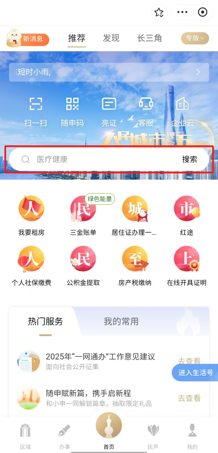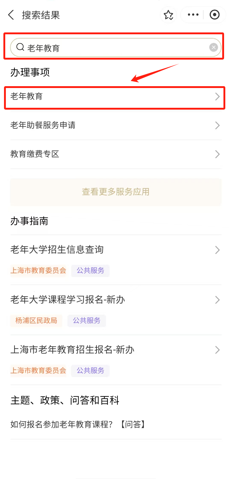 1、打开“随申办市民云”(支付宝小程序、APP、微信小程序),首页搜索关键词“老年教育”,即可进入对应服务。