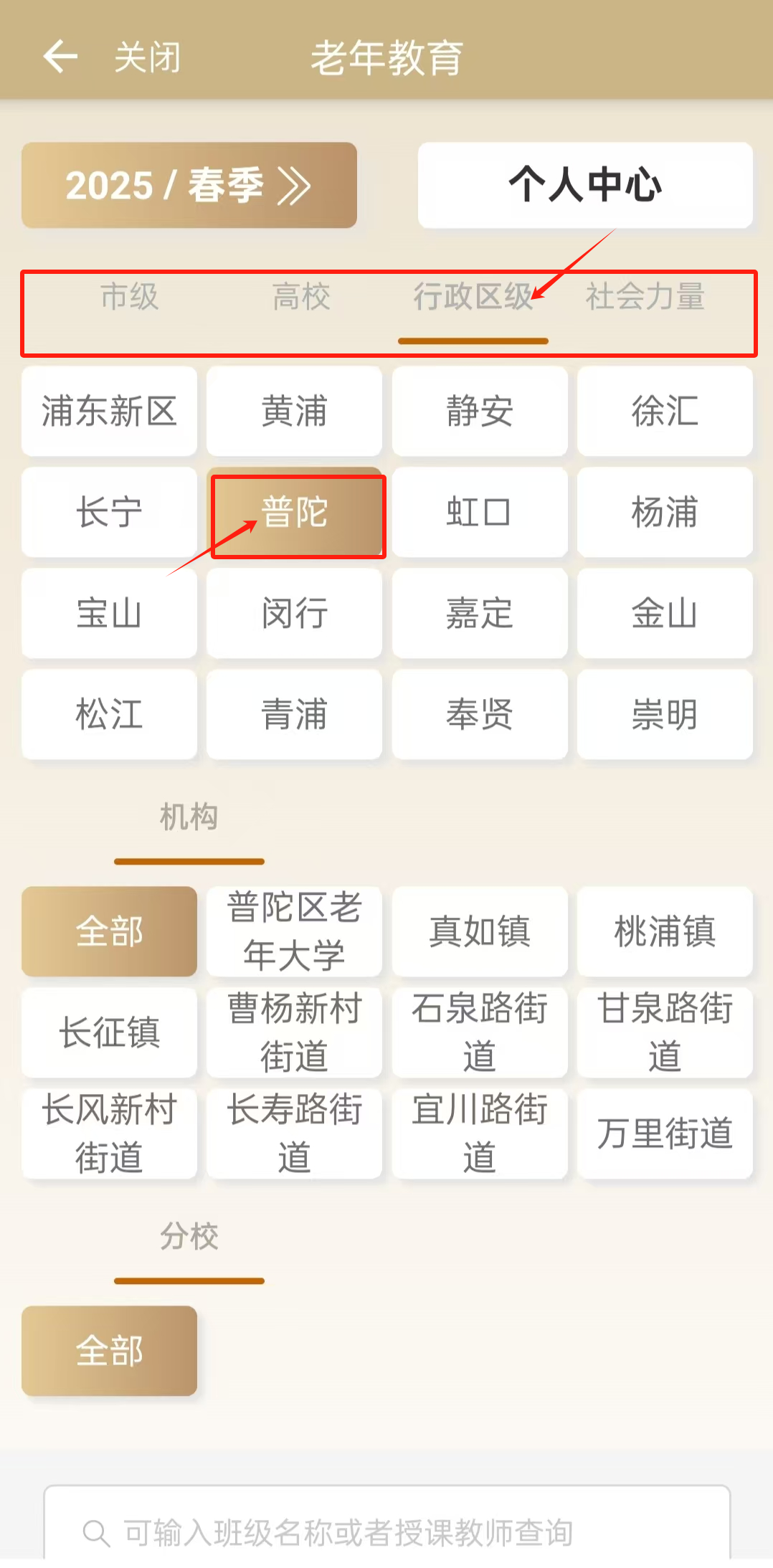 如果你想选择“普陀区”的课程,可以点击“行政区级”,选择“普陀”,再点击“查询”。