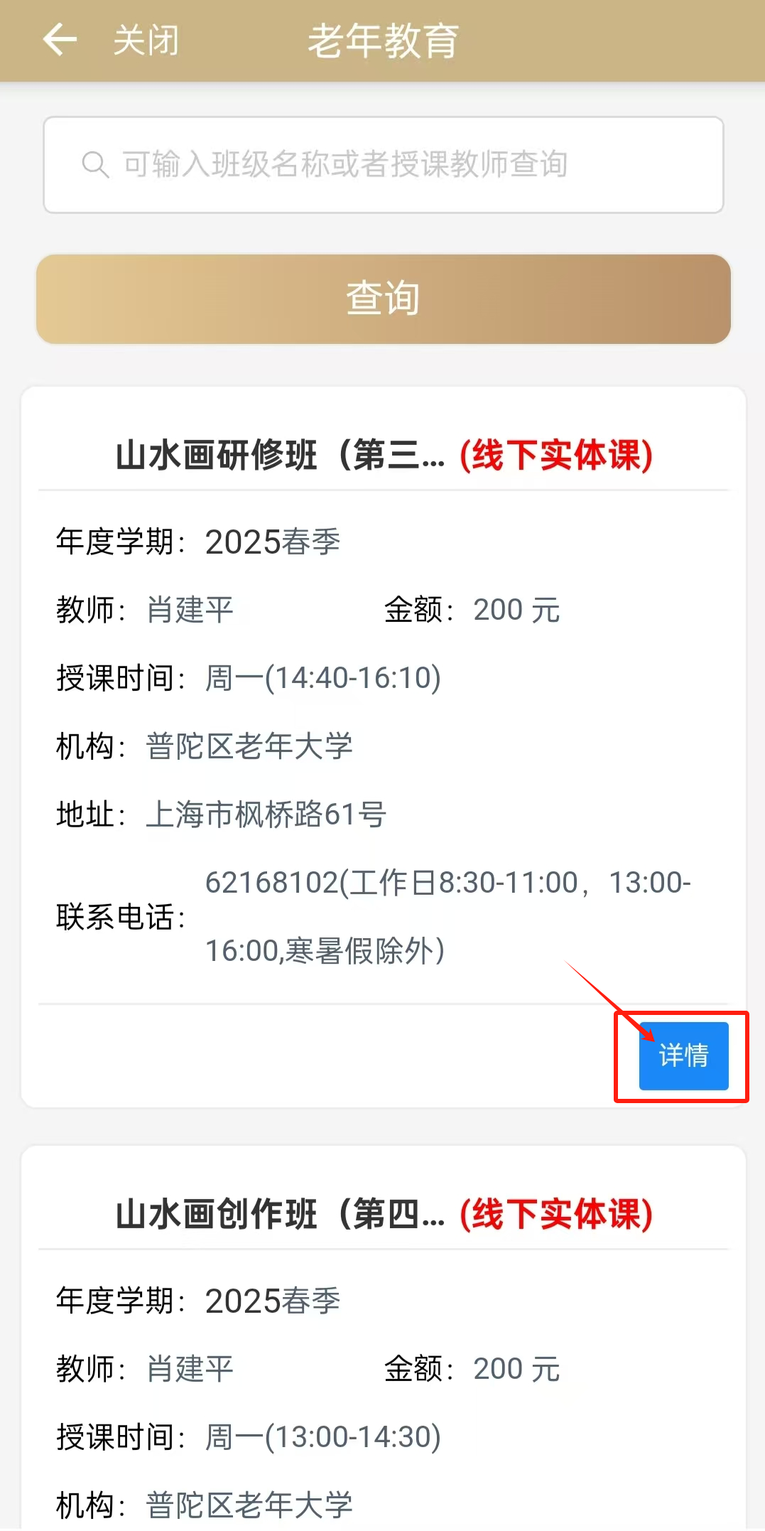 3、跳转至课程列表页后,即可查看课程基本信息。点击“详情”,进一步了解学校招生简章、授课时间、授课地址、课程费用和退课操作等信息。点击“报名”进行线上报名。
