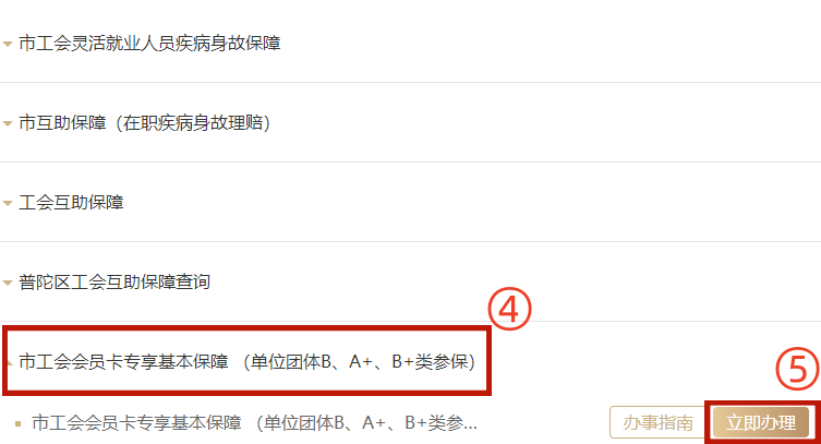 3、点击“市工会会员卡专享基本保障(单位团体B、A+、B+类参保),选择“立即办理”。