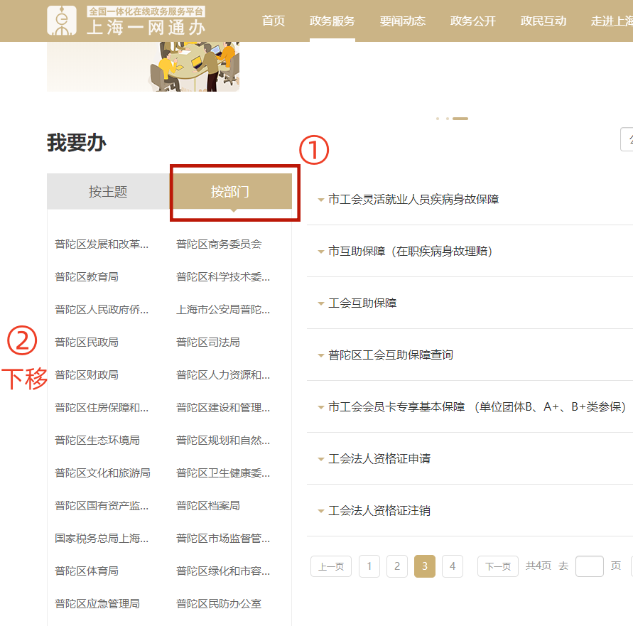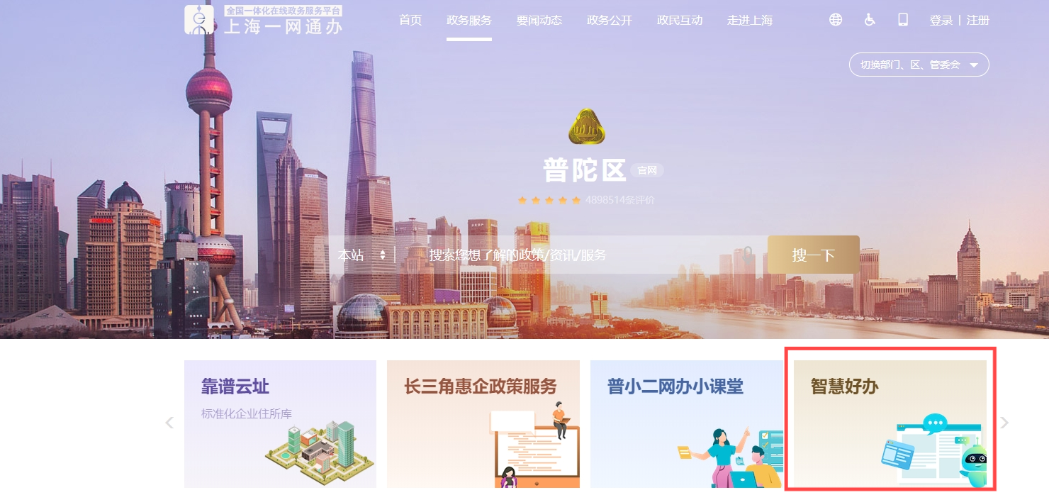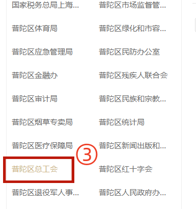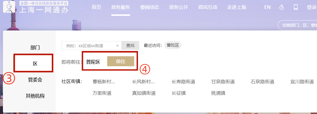 1、选择“切换部门、区、管委会”—“普陀区”—“前往”—“普陀官网”。