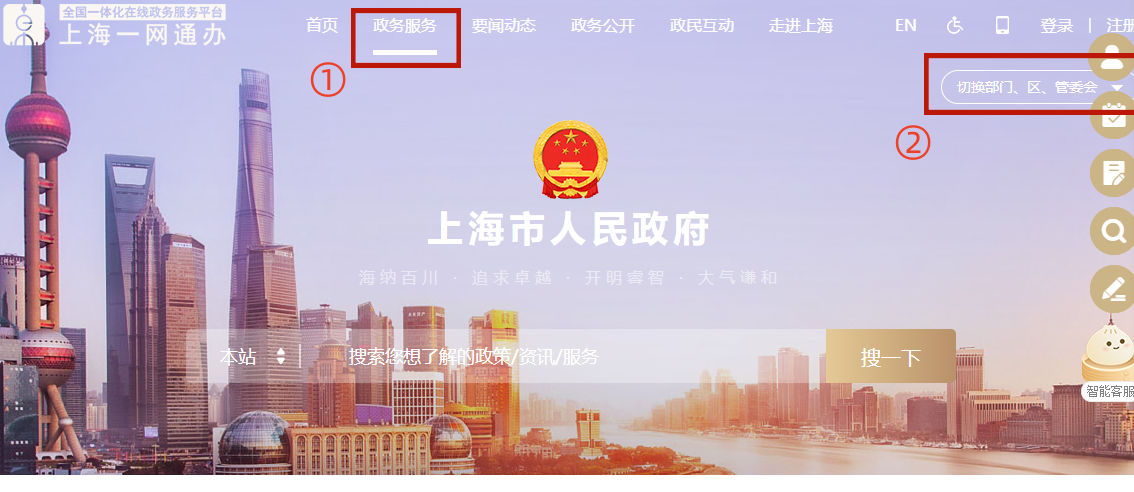 登录“上海一网通办”,输入以下网址:https://zwdt.sh.gov.cn/govPortals/region/SH00PT或直接通过搜索引擎搜索“上海一网通办”进入。