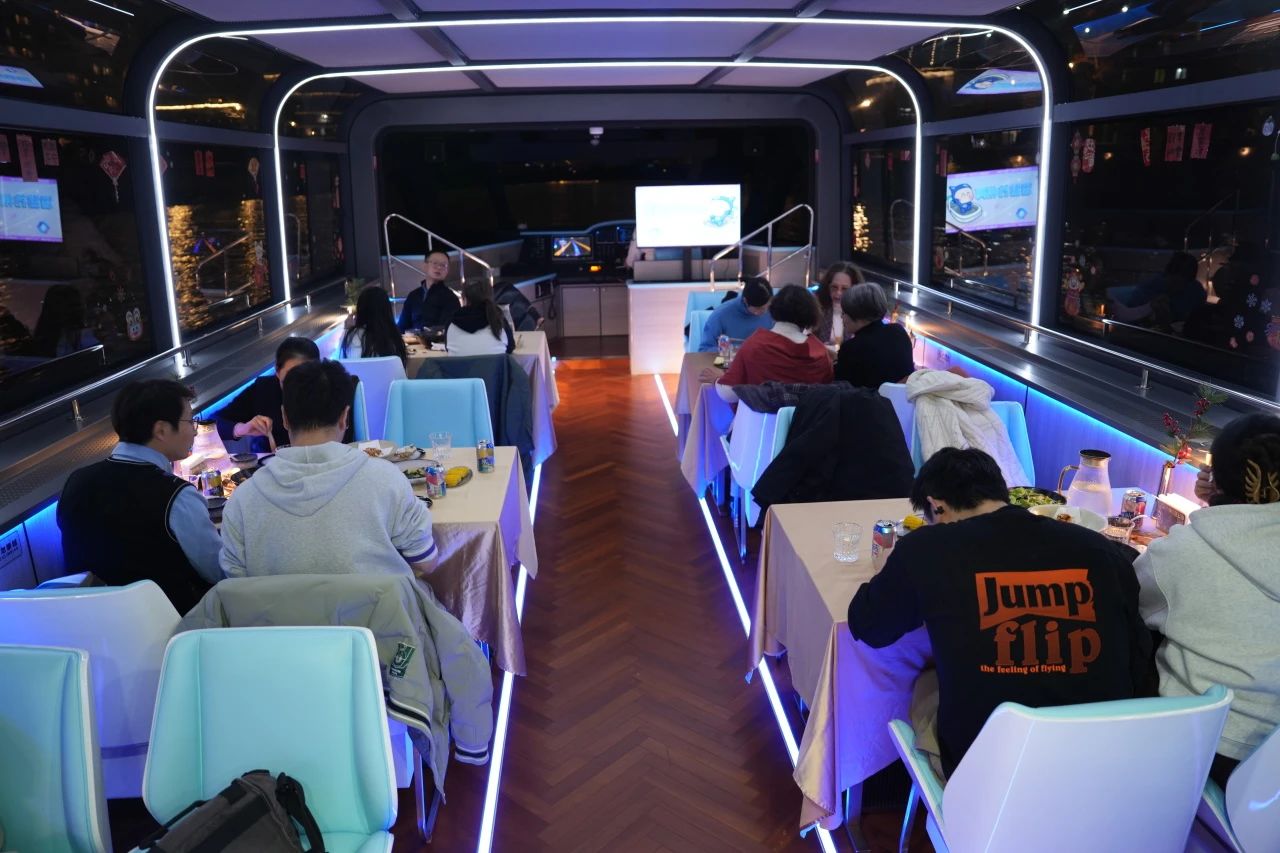 不同于传统的排列型座位最高乘坐37人,游船内部调整为餐饮航班时最多可接待6桌、24人次,此举充分考虑了游客的乘船体验和餐桌距离,市民游客不仅能近距离欣赏到苏州河璀璨夜景,还能在氤氲浪漫氛围的游船上品味美食。