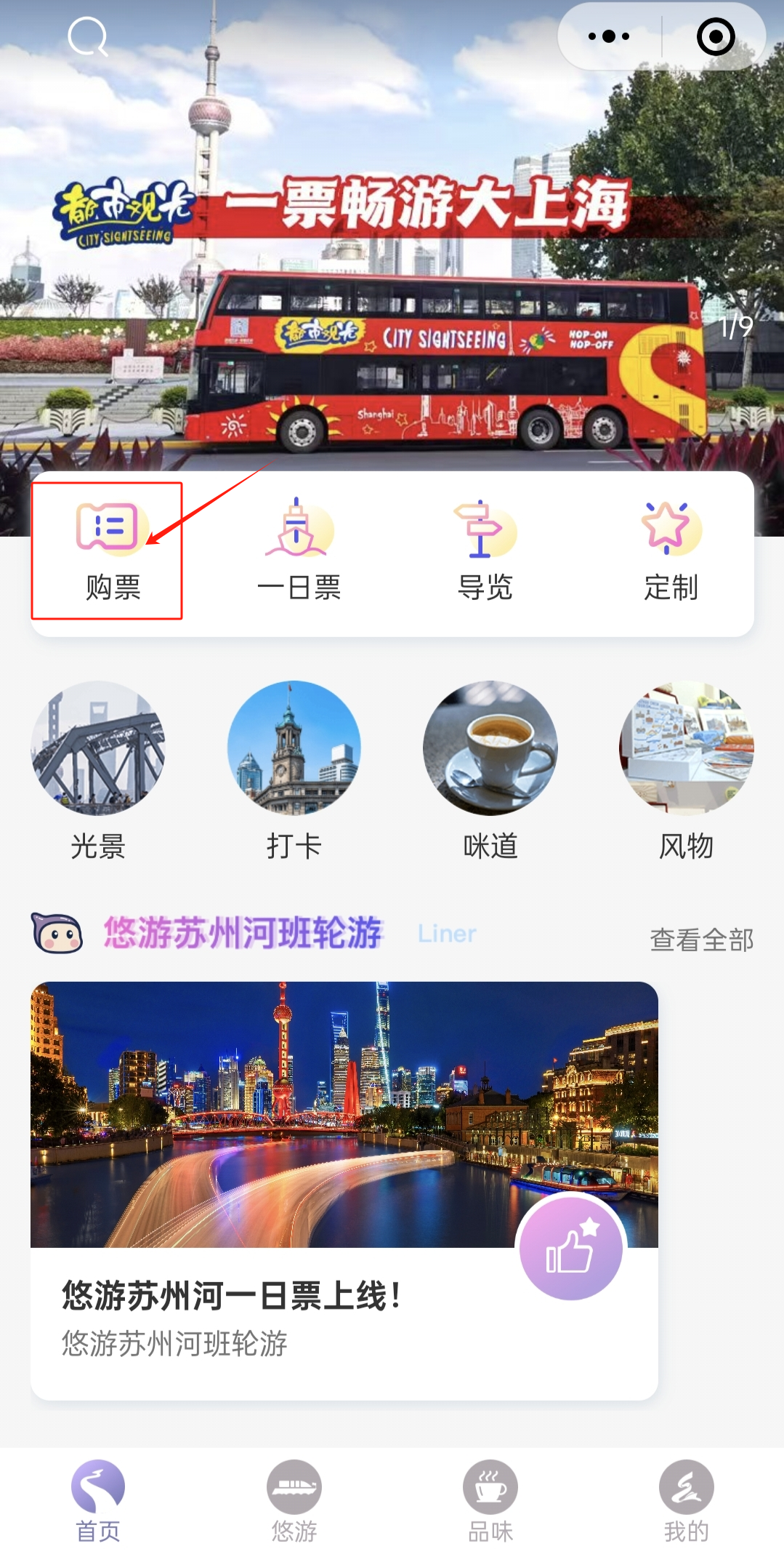 第一步:打开“悠游苏州河”小程序,点击“购票”