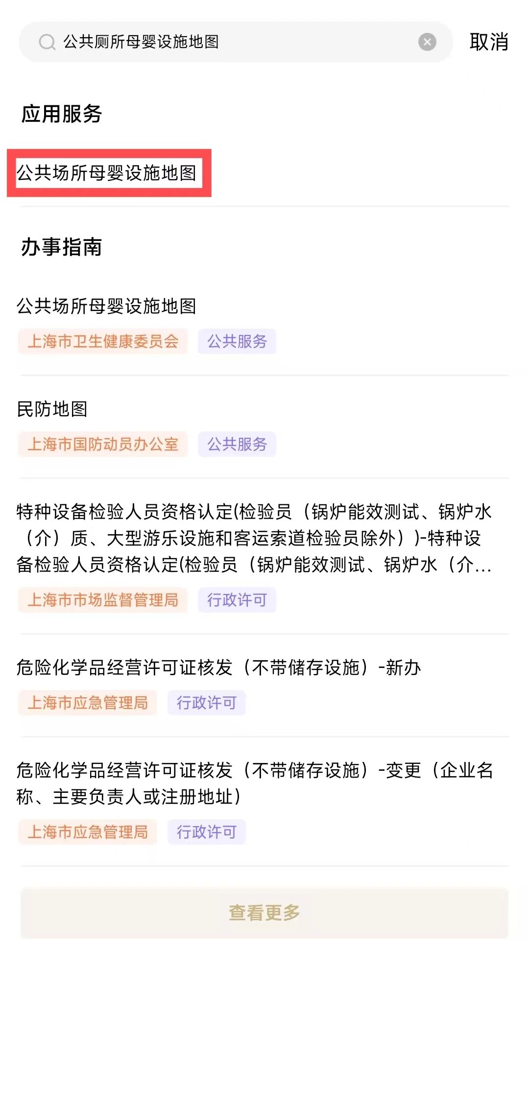 进入方式:打开“随申办市民云”(APP、微信小程序、支付宝小程序)首页搜索“公共场所母婴设施地图”,点击进入。