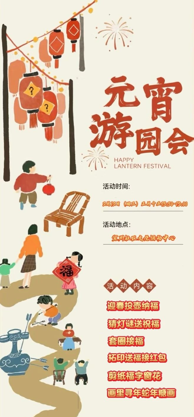 活动内容:迎春投壶纳福 、猜灯谜送祝福 、套圈接福、剪纸福字窗花、画里寻年蛇年糖画……