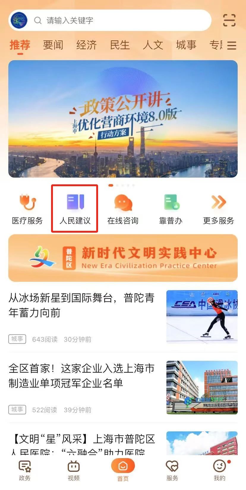 2.可登录“上海普陀”APP、上海普陀区政府门户网站,在“人民建议征集”专栏提出建议。