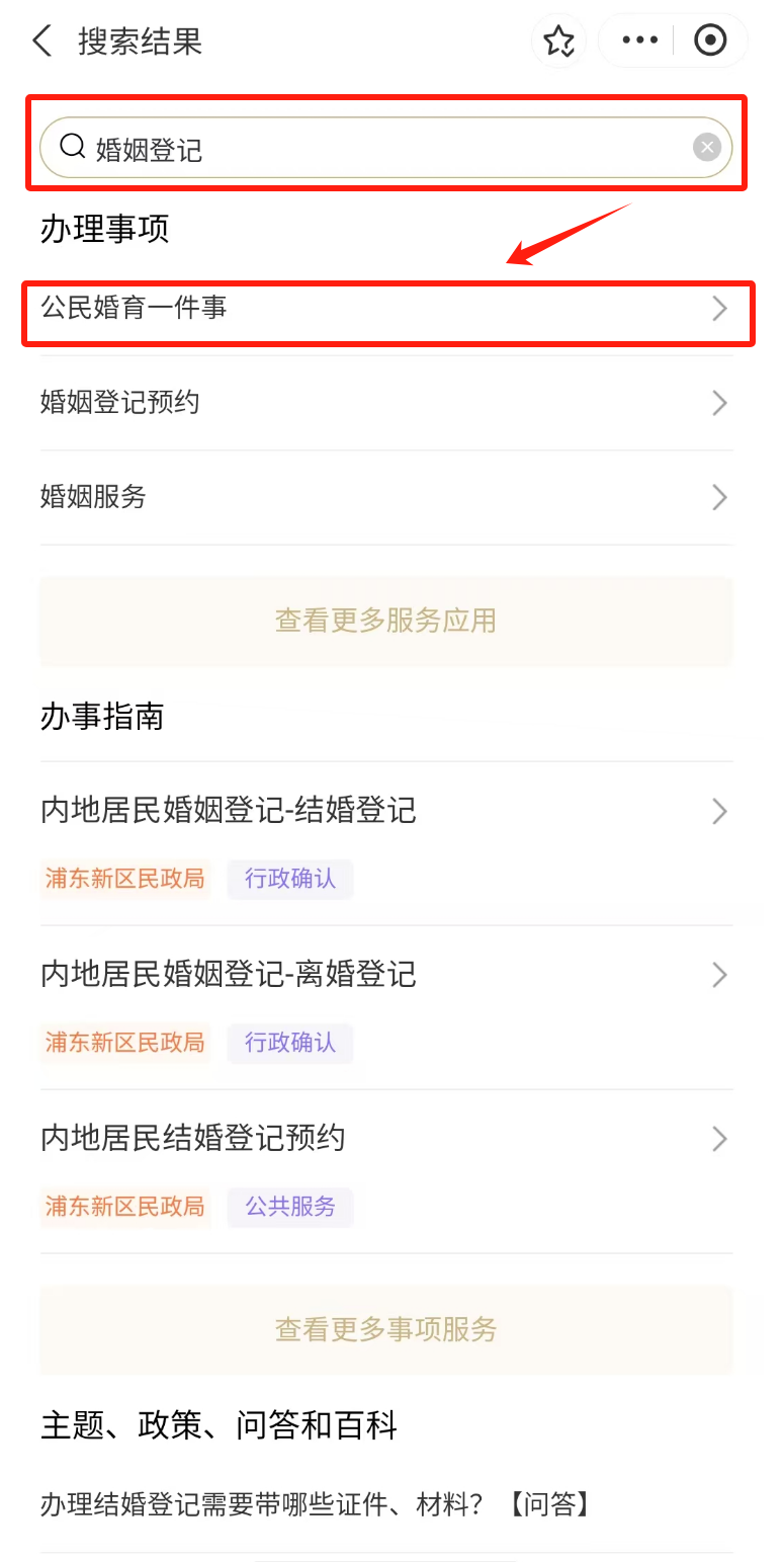 服务入口:“随申办市民云”(APP、微信小程序、支付宝小程序),首页搜索“婚姻登记”,点击进入“公民婚育一件事”。