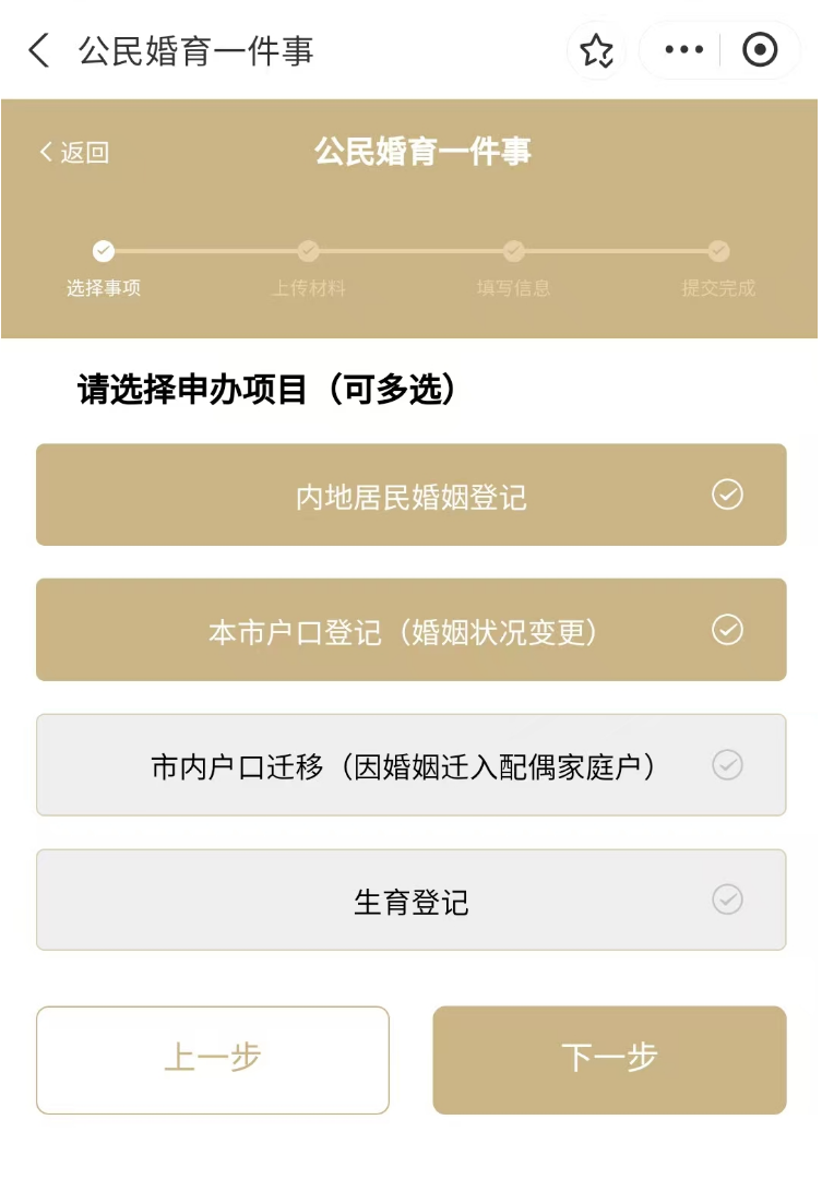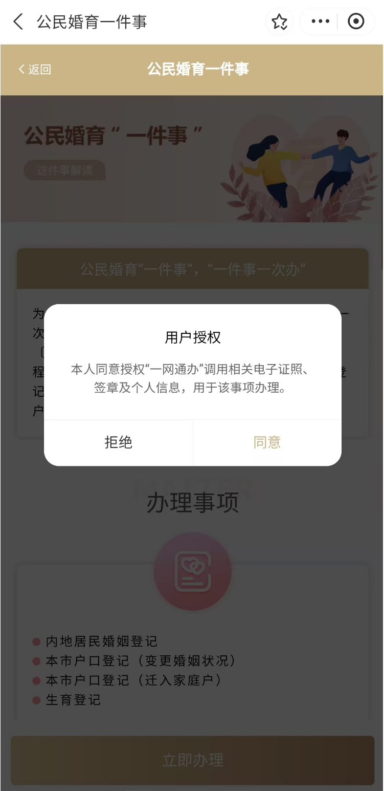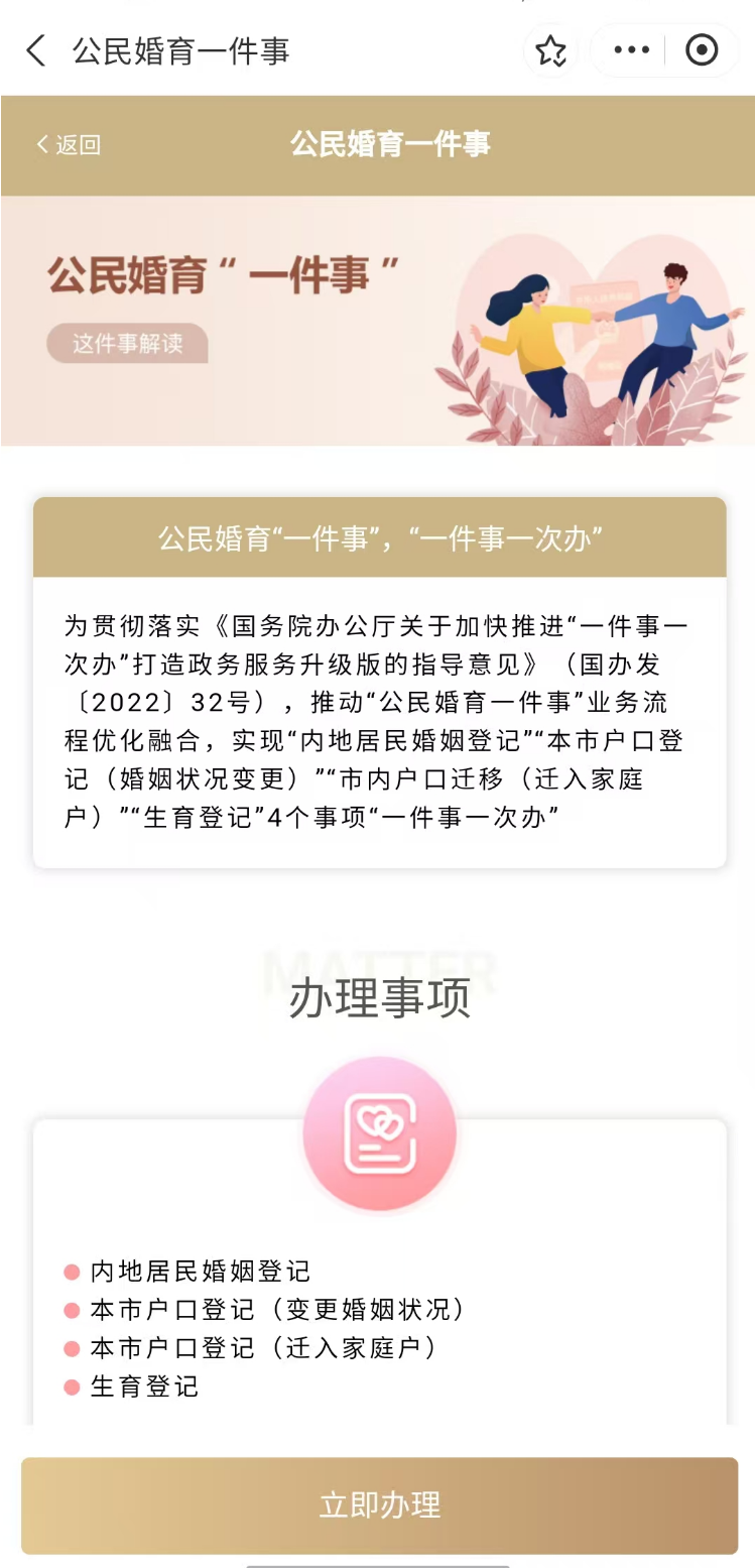 本市常住户口居民,通过“公民婚育一件事”服务,还可以实现内地居民婚姻登记、本市户口登记(婚姻状况变更)、市内户口迁移(因婚姻迁入配偶家庭户)、生育登记4个事项一次办哦~