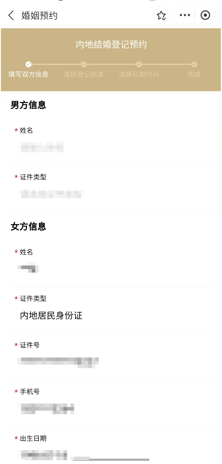 2、以“内地结婚登记预约”为例,仔细阅读并确认同意“婚姻登记网上预约服务协议”,填写双方的资料信息,选择相应的登记机关并预约日期和时间,即可完成预约流程。