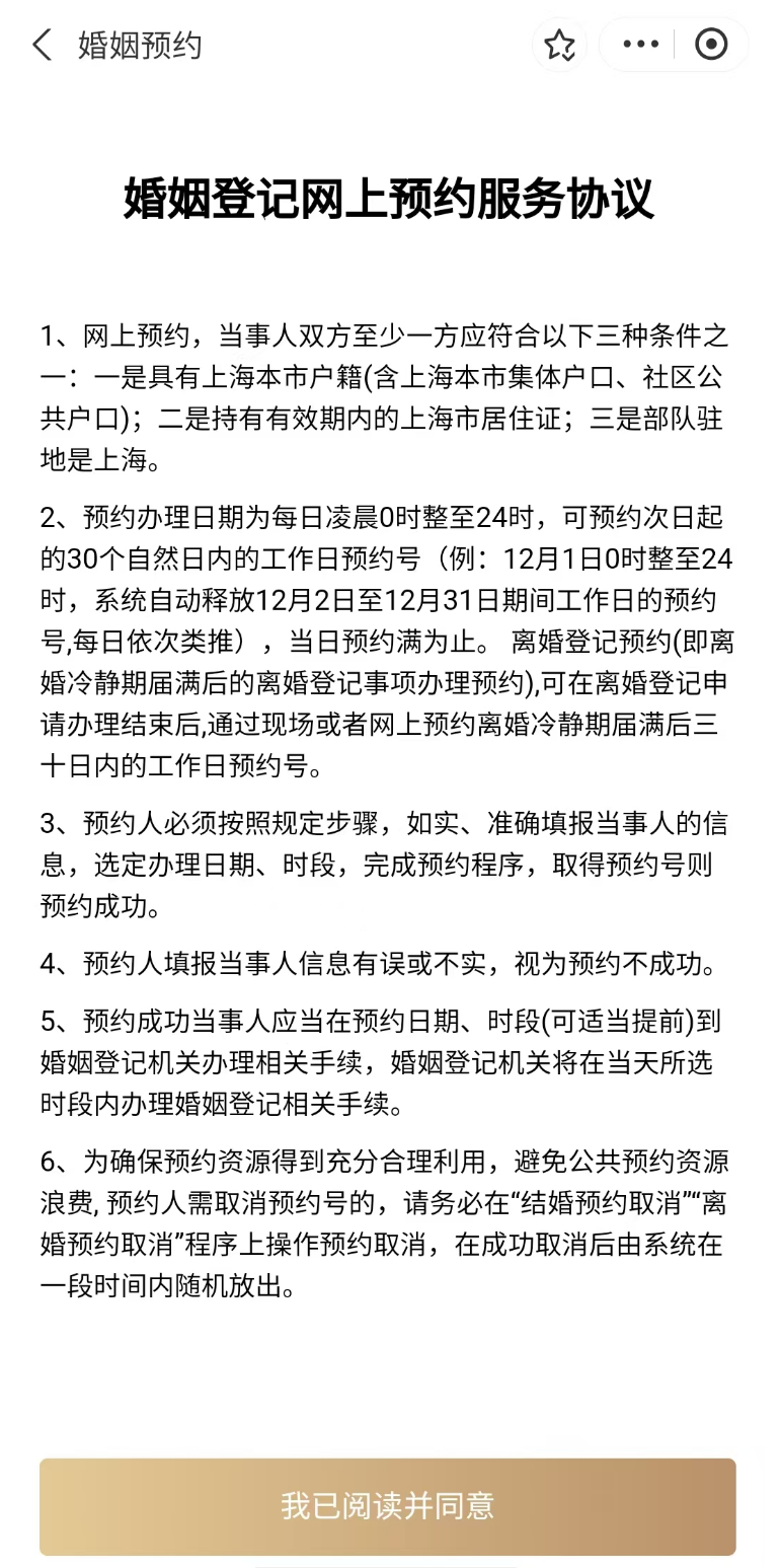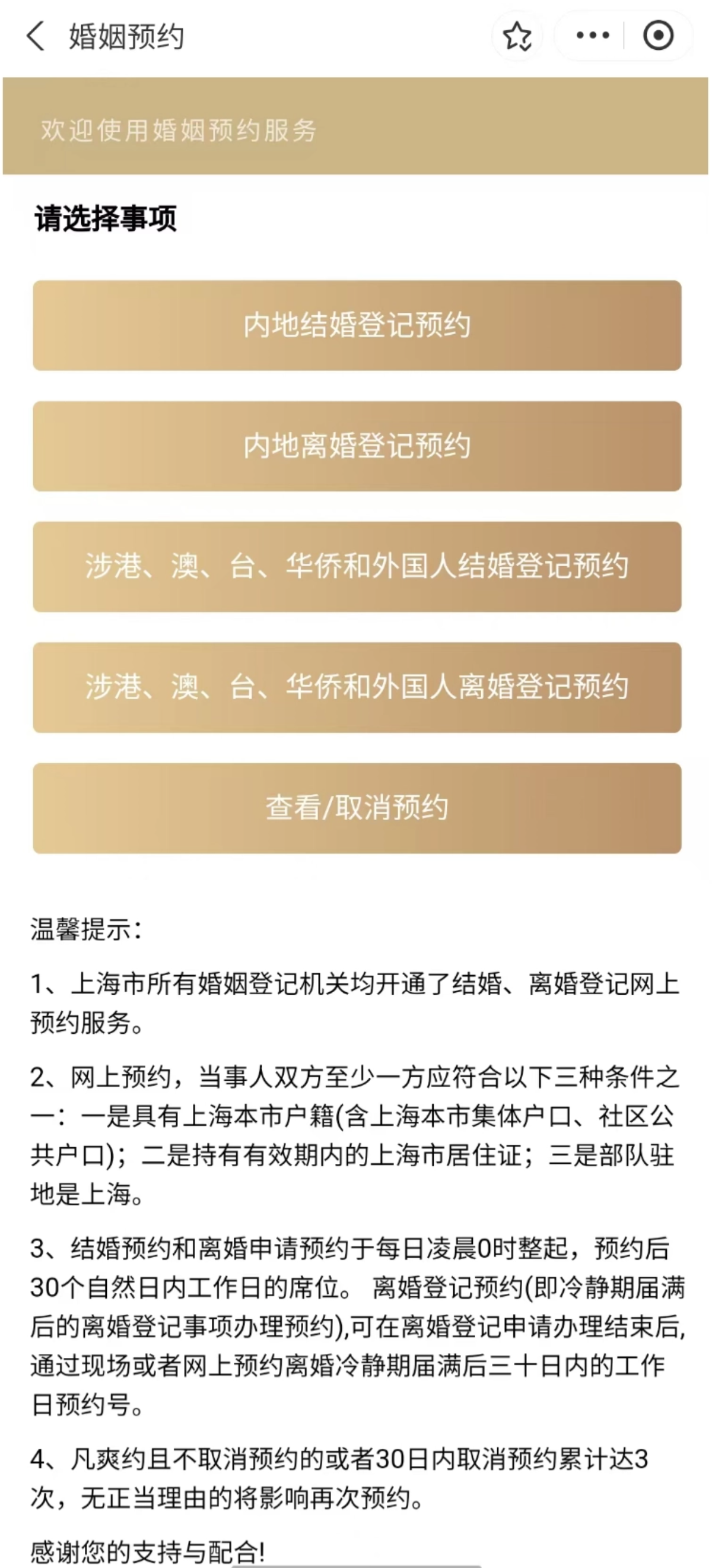 预约入口:“随申办市民云”(APP、微信小程序、支付宝小程序),首页搜索“婚姻登记”,选择“婚姻登记预约”服务,进入服务专区。