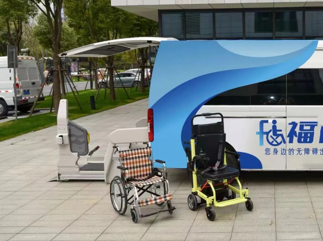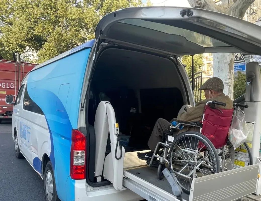 与普通的爬楼机服务不同,这次社区安排的服务并不只有将老人送下楼,小区内还有一辆可以自动安放轮椅的面包车,等着送严奶奶前往寿宴现场。这辆面包车有着自己的名字——福祉车。