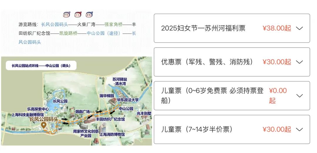 如需购票,请前往“悠游苏州河”小程序选择30分钟时长的“2025妇女节——苏州河福利票”。