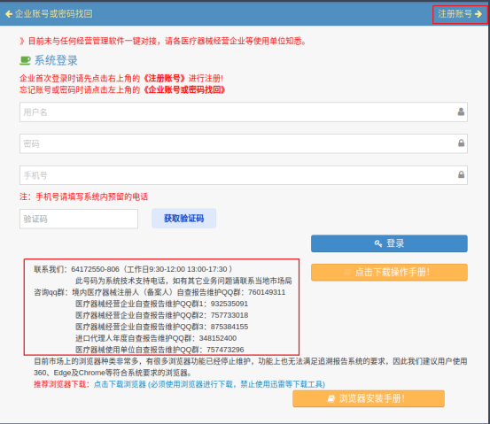 1、首次使用系统的企业,可以在“医疗器械追溯申报系统”首页进行“注册账号”,按照要求填写企业相关信息,审核通过后,系统登录账号等相关信息将以短信形式发送给申请联系人。