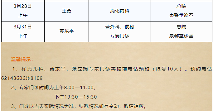 1、门诊以当天实际情况为准,特殊情况如有变动,敬请谅解。