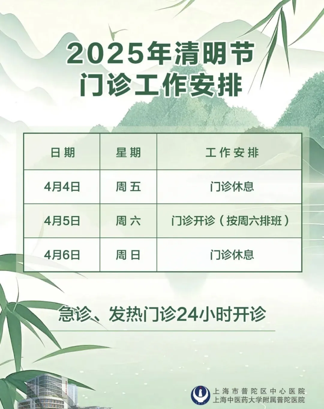2025年清明假期普陀区中心医院、普陀区人民医院、普陀区利群医院门诊工作安排如下: