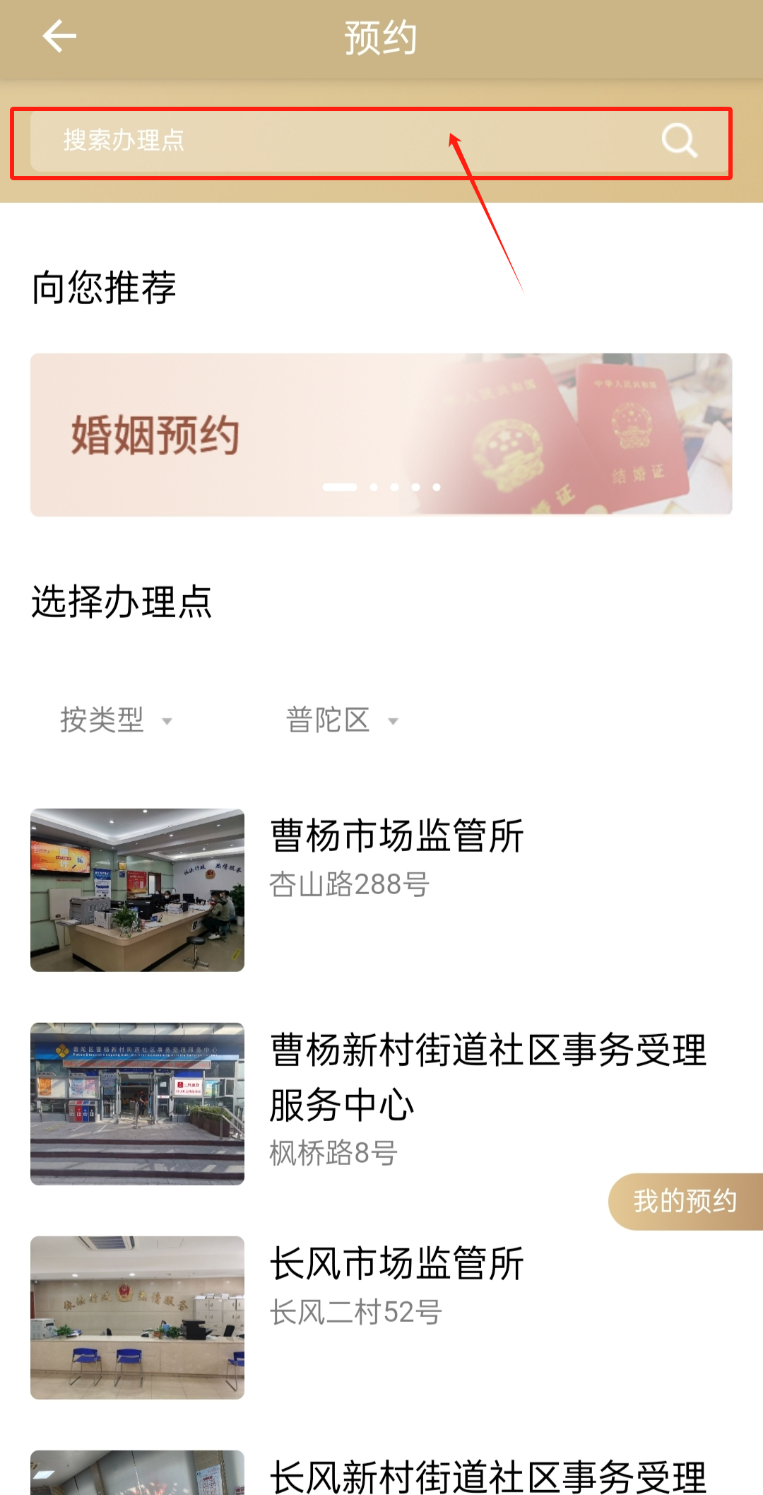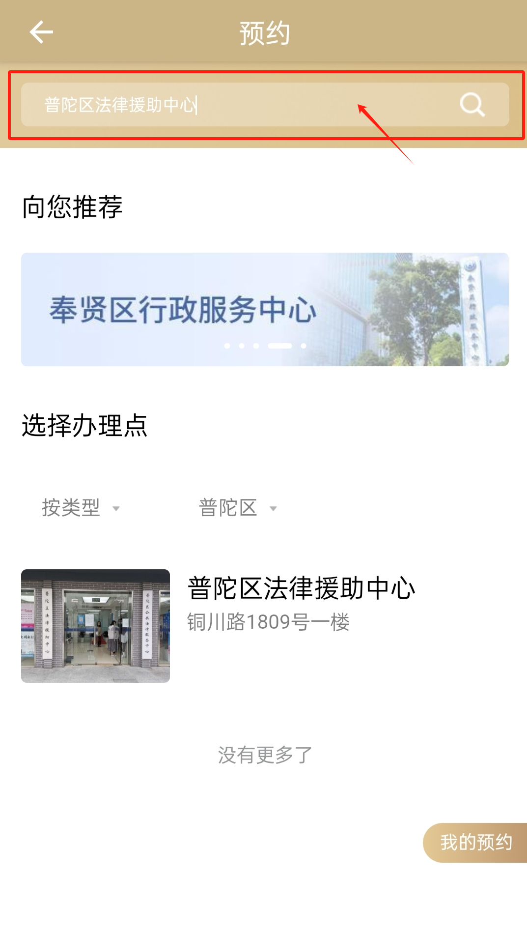 第二步:在搜索栏输入您要前往办事的机构名称,如:普陀区法律援助中心,选择后进入预约界面