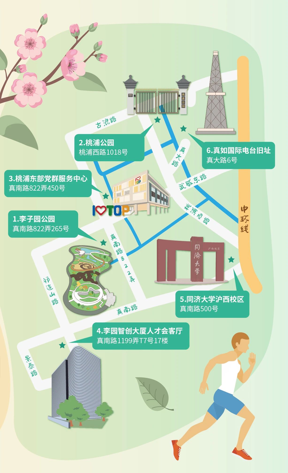 路线:李子园公园-桃浦公园-桃浦东部党群服务中心-李园智创大厦-同济大学沪西校区-真如国际电台旧址