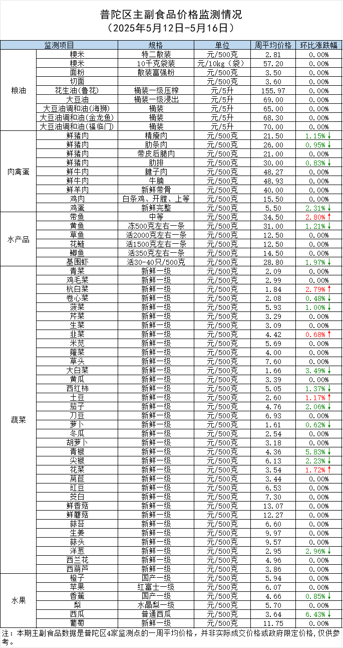 普陀区主副食品价格监测情况 (2025年5月16日)