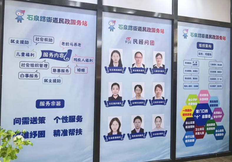 提供困难群体就业援助、儿童福利、残疾人帮扶、老龄养老服务、婚姻登记、白事咨询等服务,通过全科服务清单、智能服务地图、品牌活动专栏、综合受理窗口、民星服务团队等“五个一”工程,切实提升居民获得感、幸福感。