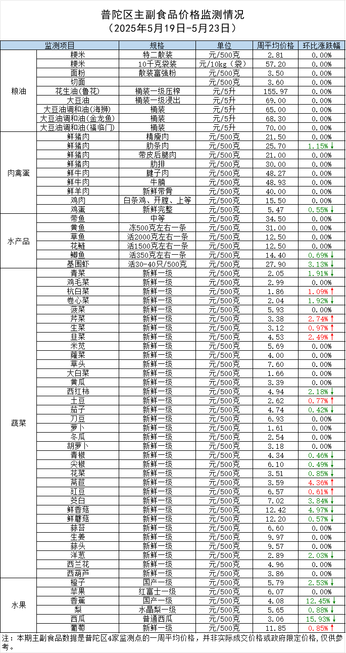 普陀区主副食品价格监测情况 (2025年5月23日)