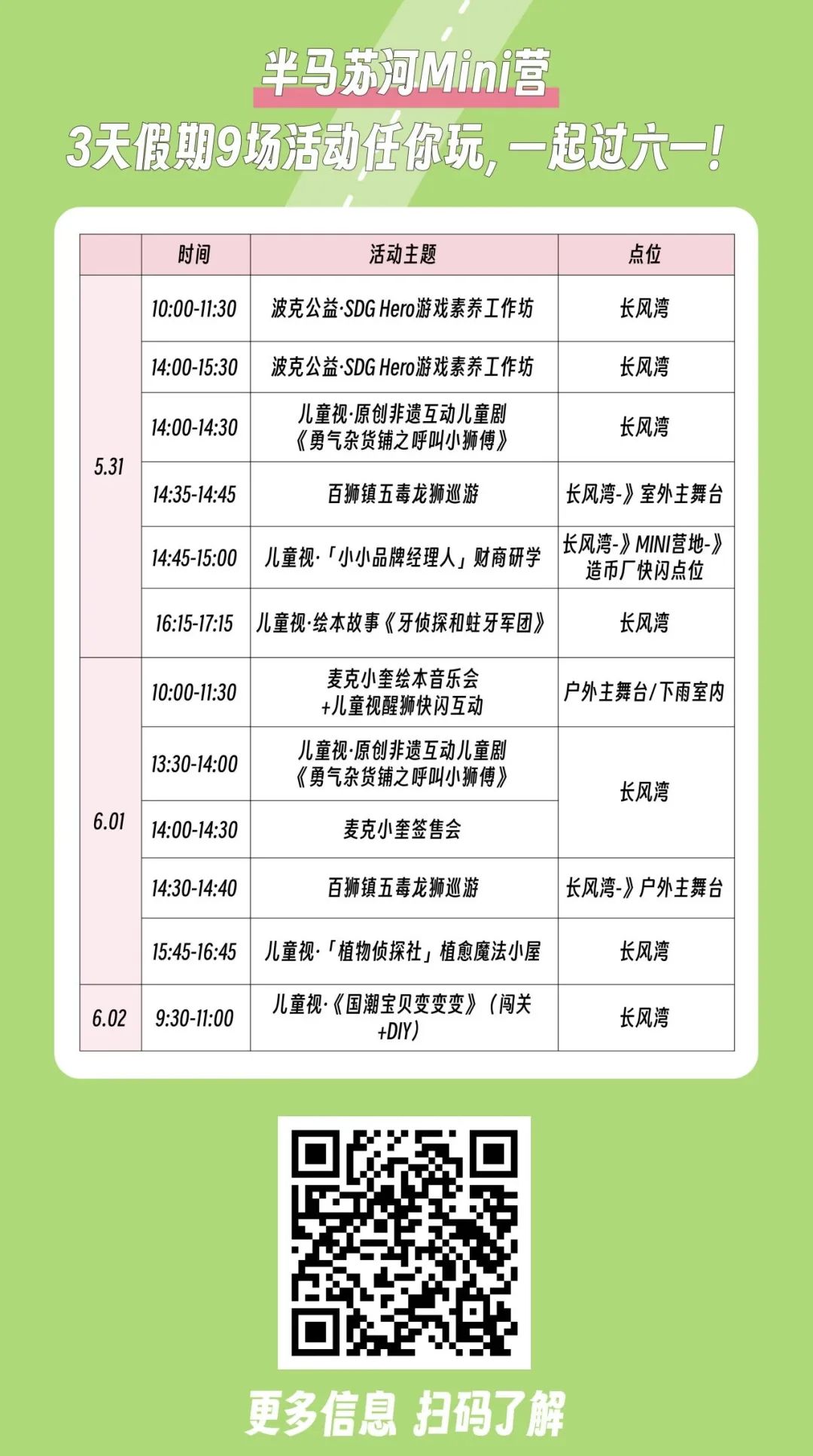 当端午节邂逅儿童节,“半马苏河Mini营”精心准备了9场活动,让孩子们在玩中学习、在互动中结交伙伴。精彩内容纷呈:波克公益·SDG Hero游戏素养工作坊引导青少年认知可持续发展目标;原创非遗互动儿童剧《勇气杂货铺之呼叫小狮傅》带来传统文化的趣味演绎;儿童视·「小小品牌经理人」财商研学开启孩子们的商业启蒙……
