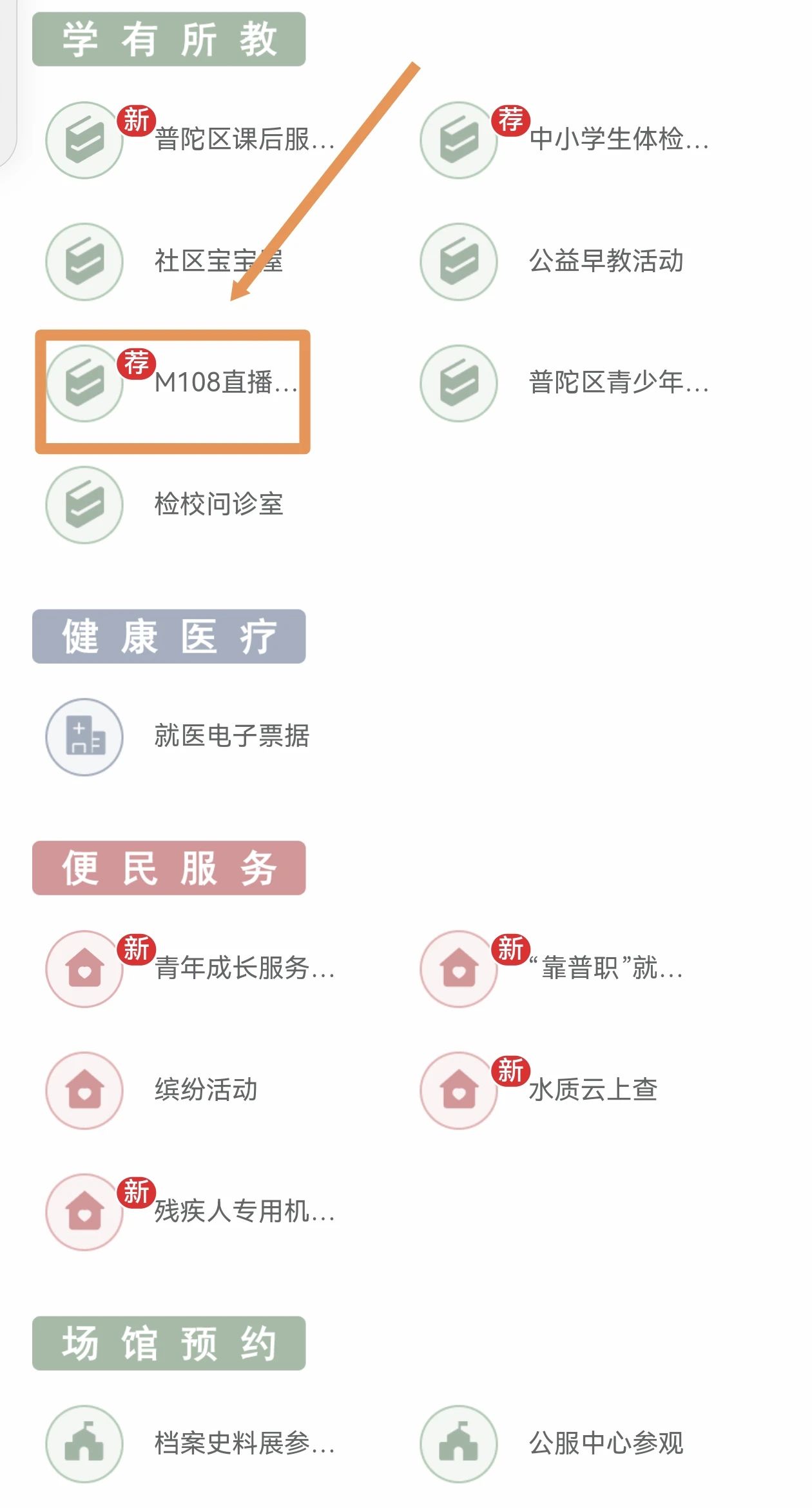 第二步:点击普陀旗舰店首页的 “热门应用-更多”,找到“学有所教-M108直播”图标,点击进入;