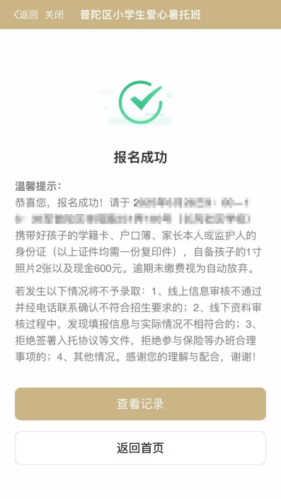 4. 报名成功后,根据“温馨提示”信息,携带相关材料在指定时间,前往相应地点完成入托协议签署和确认缴费等事宜。