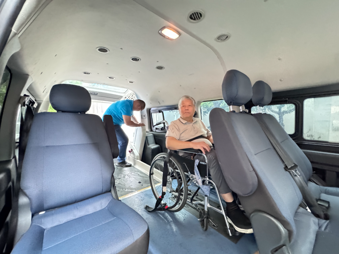 来到楼下后,配备全尺寸升降机的福祉车便开始接力服务。据介绍,目前普陀的福祉车由7人座客车改造而成。这种车型的优势之一便是老年人从“爬楼机”换上轮椅后,可直接推入车内固定,全程由专业人员操作。老人只需安稳就座,就能安全出行。