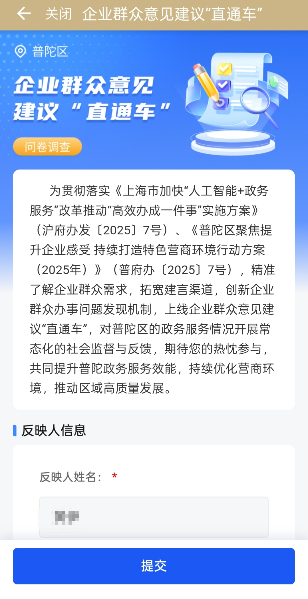 来源: 上海普陀为贯彻落实《上海市加快“人工智能+政务服务”改革推动“高效办成一件事”实施方案》(沪府办发〔2025〕7号)、《普陀区聚焦提升企业感受 持续打造特色营商环境行动方案(2025年)》(普府办〔2025〕7号),精准了解企业群众需求,拓宽建言渠道,创新企业群众办事问题发现机制,我们上线了企业群众意见建议“直通车”,对普陀区的政务服务情况开展常态化的社会监督与反馈,期待您的热忱参与,共同提升普陀政务服务效能,持续优化营商环境,推动区域高质量发展。
