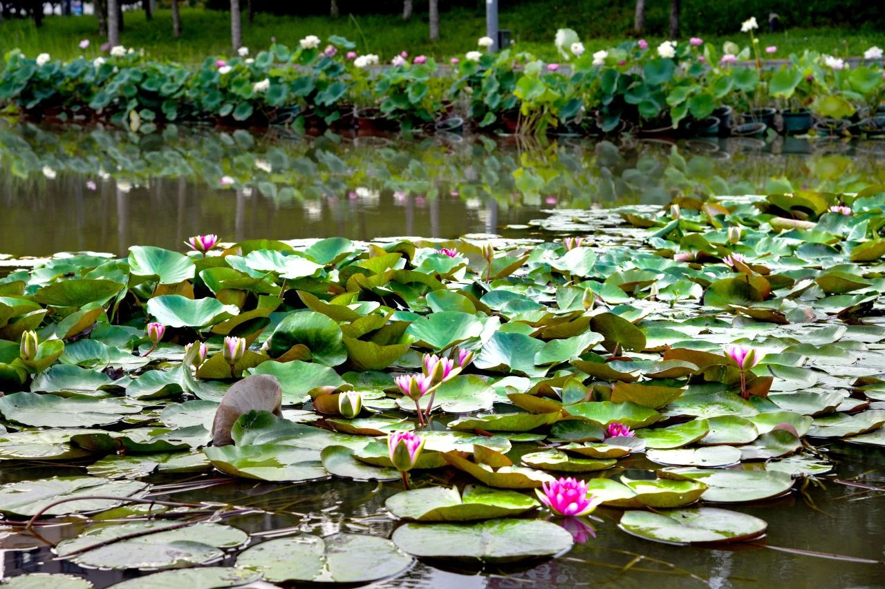 启动林公园的睡莲池独具特色,池水清澈见底,睡莲白色的根茎在水中舒展,清晰可见。岸边点缀的几株“夏花”,粉紫的花瓣偶尔飘落池中,与睡莲相映成趣,构成了一幅灵动的画面,随手一拍都如“莫奈花园”般唯美。