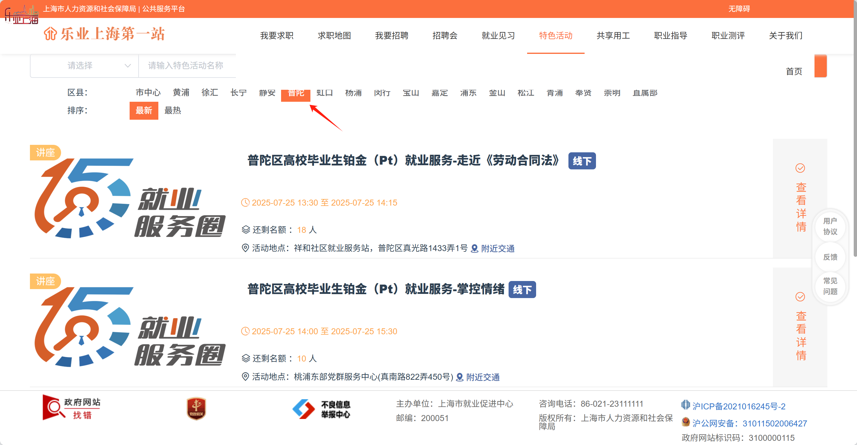2. 在“区县”一栏中勾选普陀区,下滑翻找到到对应活动,点击“查看详情”进入详情页。